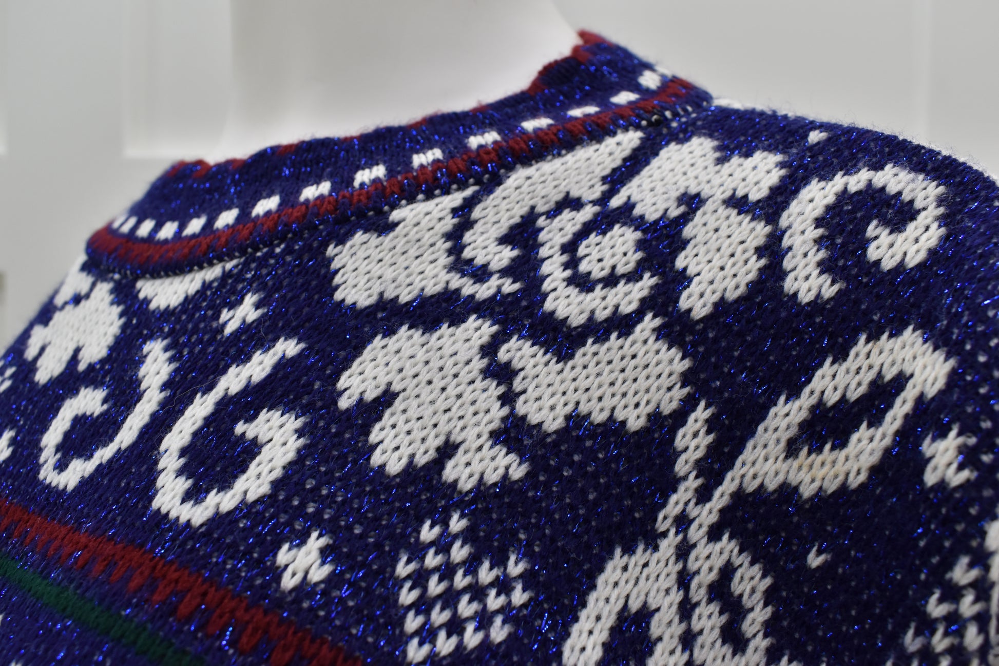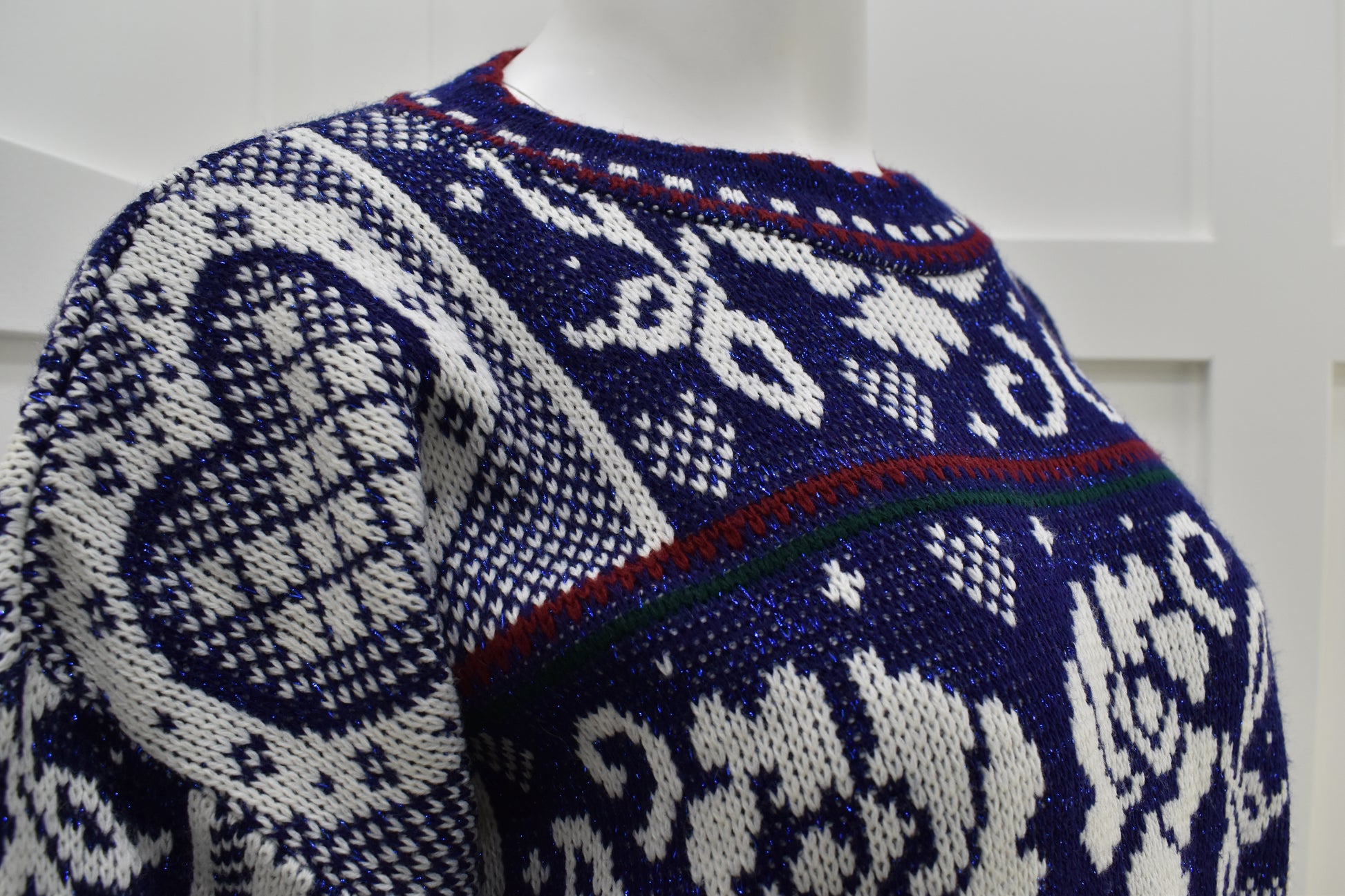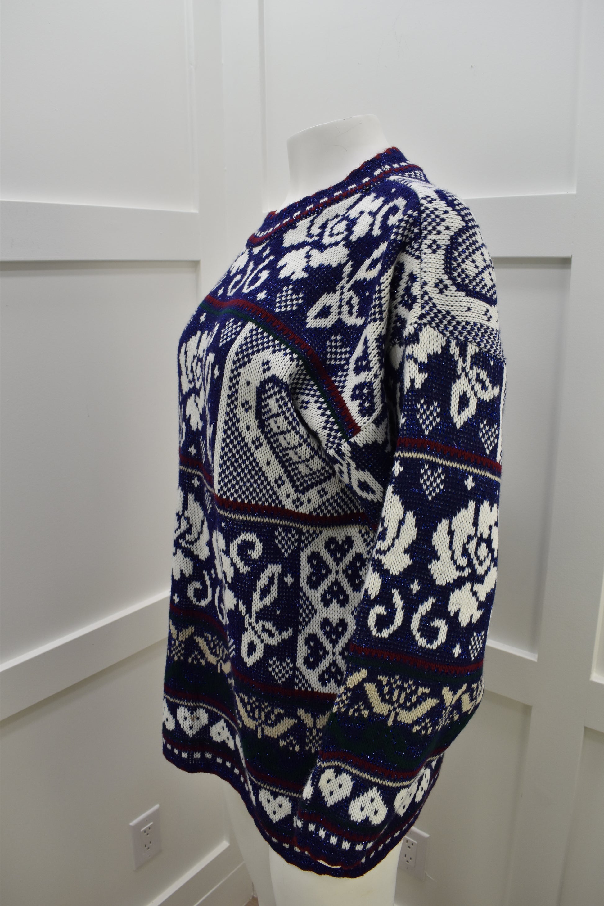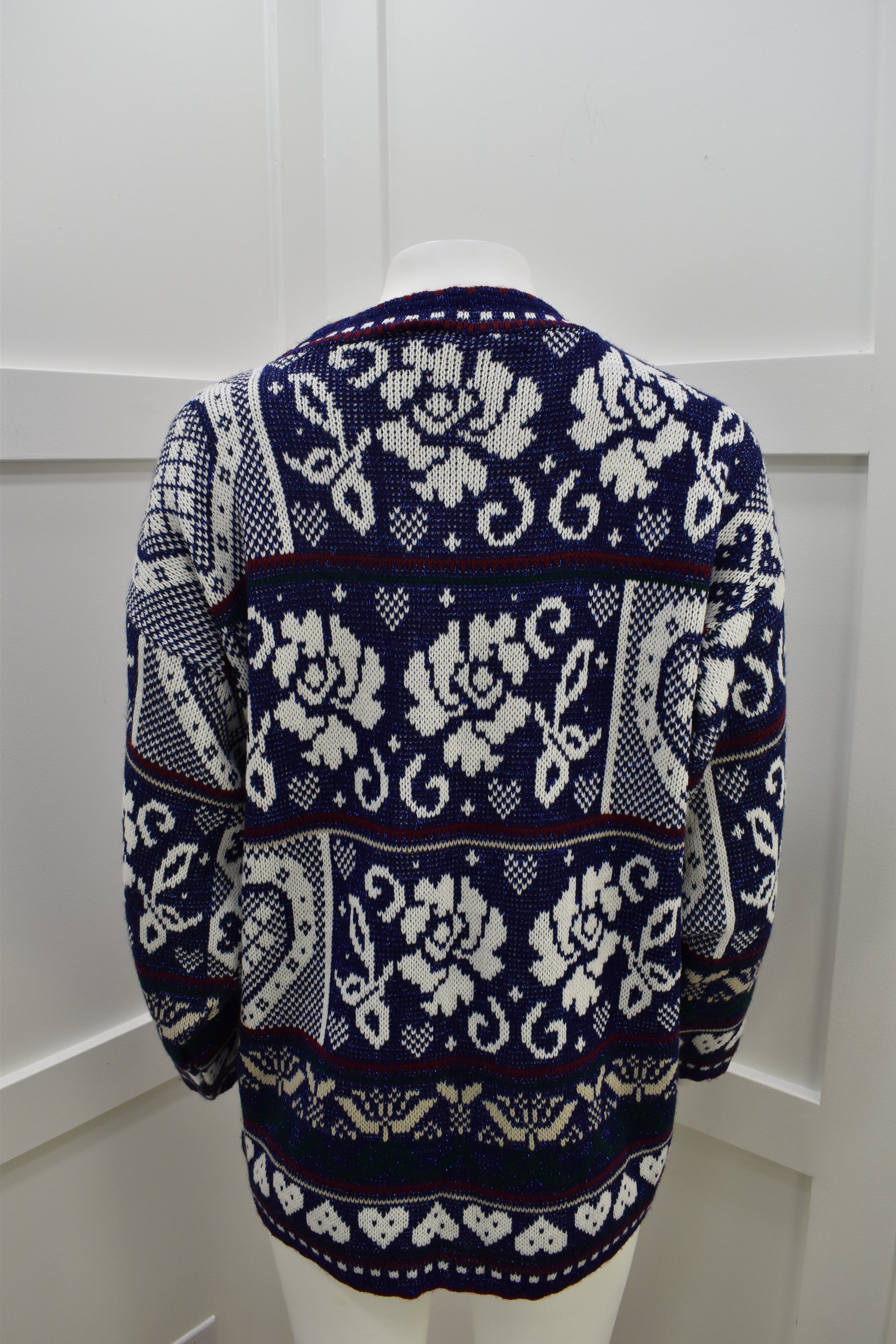 Vintage 1980s deep blue sweater in beautiful floral print. Festive and comfy novelty sweater. No closures, slips on easily over the head.